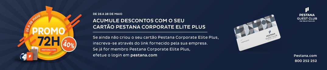 Campanha que acumula descontos em alojamento com os 15% do cartão Pestana Corporate Elite Plus.